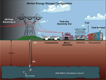 Currently there are two commercial CAES plants worldwide; the Huntorf plant in Germany and the McIntosh plant in Alabama. Both of these use diabatic processes, wherein off-peak electricity is used to compress air, which is stored, and then when (peak) electricity is required the air is mixed with natural gas and combusted. The compression is staged with inter-cooling between each stage to cool the air. The expansion process is also staged, however there are fewer stages (typically just a high pressure exapnder and a low pressure expander). The compressed air is stored in large underground salt caverns. The Huntorf plant uses a 310,000m3 cavern at a depth of 600m with a pressure tolerance between 50 - 70 bar, converted from a solution mined salt dome. It runs on a daily charging cycle of 8 hours providing a peak output of 290MW for 2 hours. The McIntosh plant has a 538,000m3 salt cavern at a depth of 450m with a pressure tolerance between 45-76 bar. Originally it provided an output of 110MW for 26 hours but in 1998 two extra generators were added and its total capacity is now 226MW.