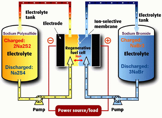 PSB is a regenerative fuel cell technology that provides a reversible electrochemical reaction between two salt solution electrolytes (sodium bromide and sodium polysulphide). PSB electrolytes are brought close together in the reactor cells where they are separated by a polymer membrane that only allows sodium ions to go through, producing about 1.5V. The net efficiency of this battery is about 75%. In the bromine/polysulfide system, the positive electrolyte is sodium bromide, and the negative electrolyte is sodium polysulfide. At the positive electrode, three bromide ions combine to form a tribromide ion. At the negative electrode, the sulfur in solution is shuttled between polysulfide and sulphide. The reactions are: