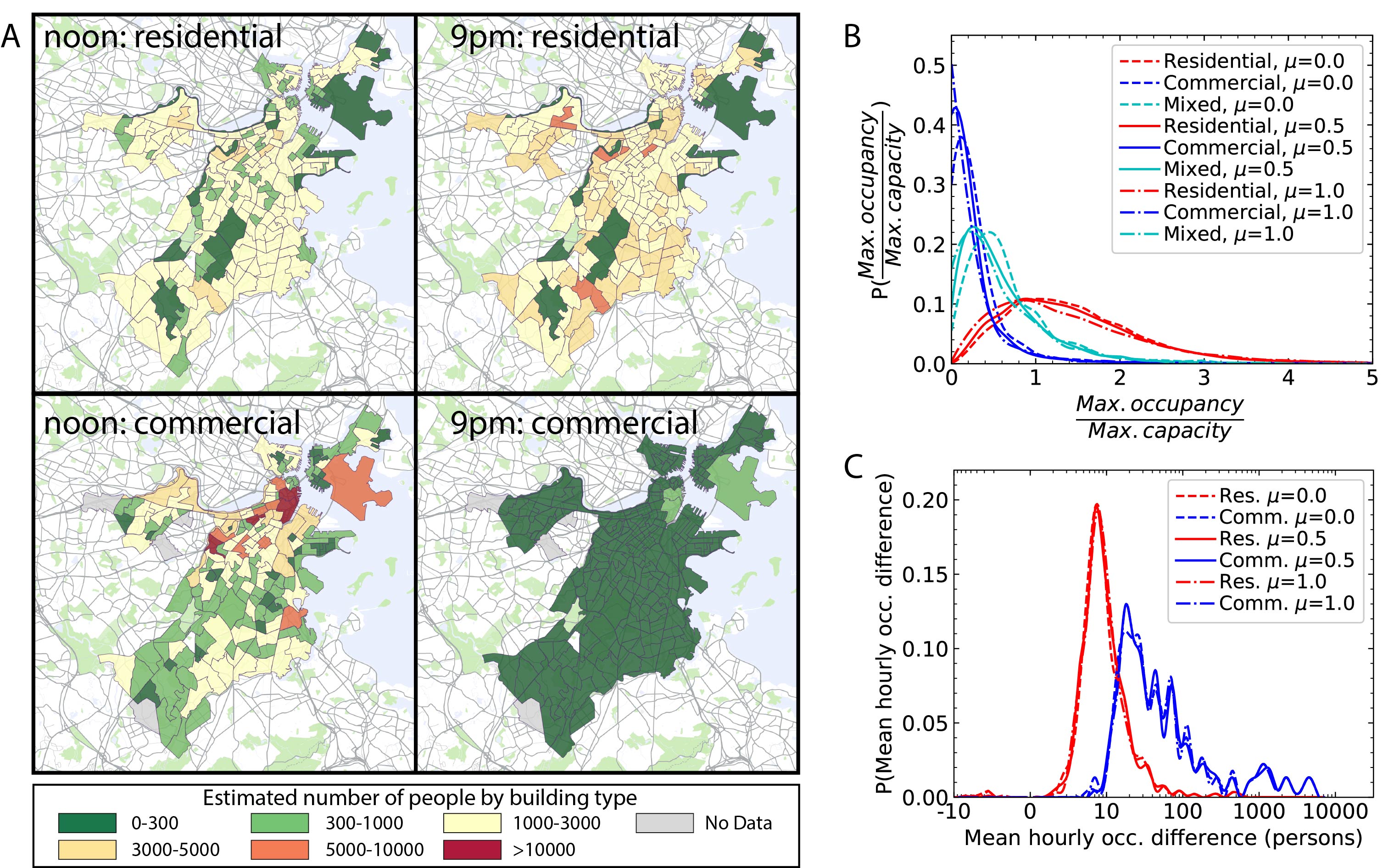 Figure 1: a Estimated number of building occupants from mobile phone data model by building type for residential and commercial buildings. b Distributions of the ratio of maximum observed building occupancy to nominal building capacity for ~83,000 buildings in Boston. c Distribution of average hourly occupancy difference between reference building occupancy (based on DOE reference building data) and mobile-inferred occupancy for the 1,266 buildings in the energy model. Positive means the reference building based occupancy assumption is greater while negative implies the opposite. Maps created using Google Maps, 2019 Google