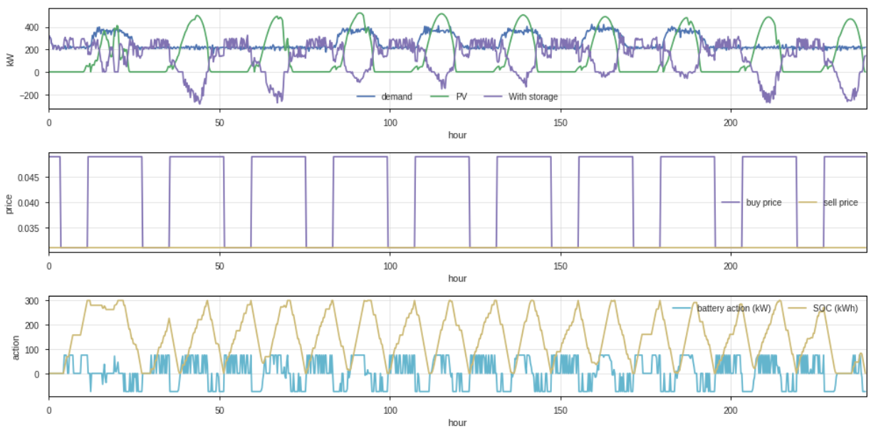 # get the total cost cost_without_batt = np.sum([(buyPrice[i]* posLoad[i]/1000 + sellPrice[i]*negLoad[i]/1000) for i in range(len(buyPrice))]) cost_with_batt = np.sum([(buyPrice[i]* outputVars[7,i]/1000 + sellPrice[i]* outputVars[8,i]/1000) for i in range(len(buyPrice))])